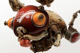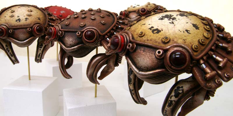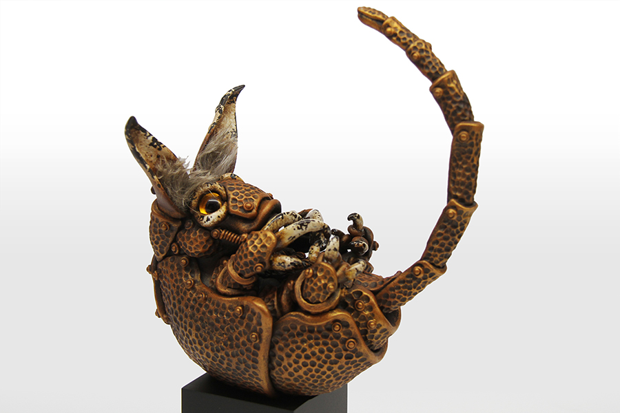 Matsouka finds inspiration from his childhood memories and deteriorated devices. Creating worn out devices that fuse animals and fish with machinery, Matsouka primarily uses stone clay for his work, but will incorporate other materials that seem to be suitable. The sculptures are meticulously finished with acrylic paint, which aids his desire to express the progression of time.